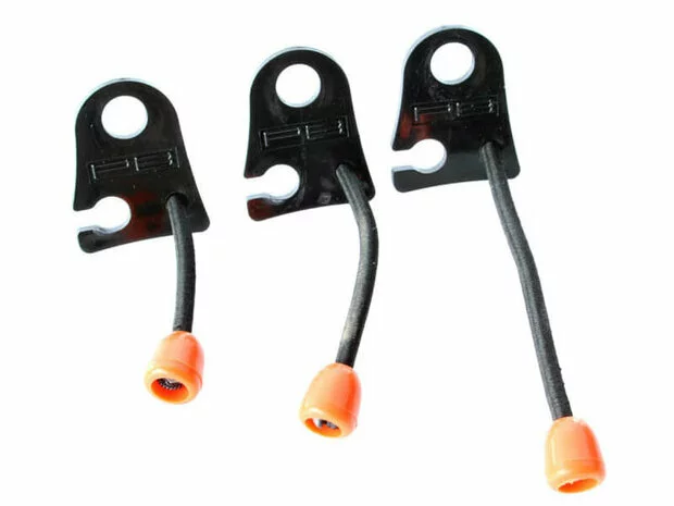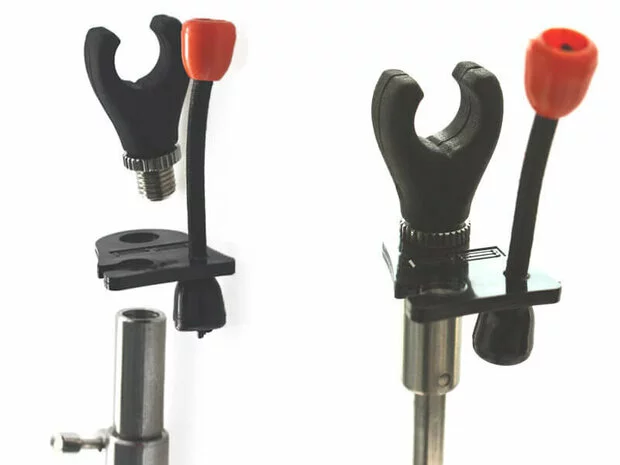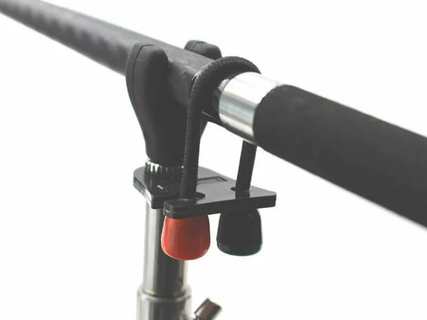 Bungee Rod Locks zijn eenvoudig te bevestigen. Je plaatst het plaatje tussen je achterste hengelsteun en de bankstick of rodpod. Het elastiek span je vervolgens om de hengel heen waarna je hem stevig vast kunt zetten in de uitsparing.