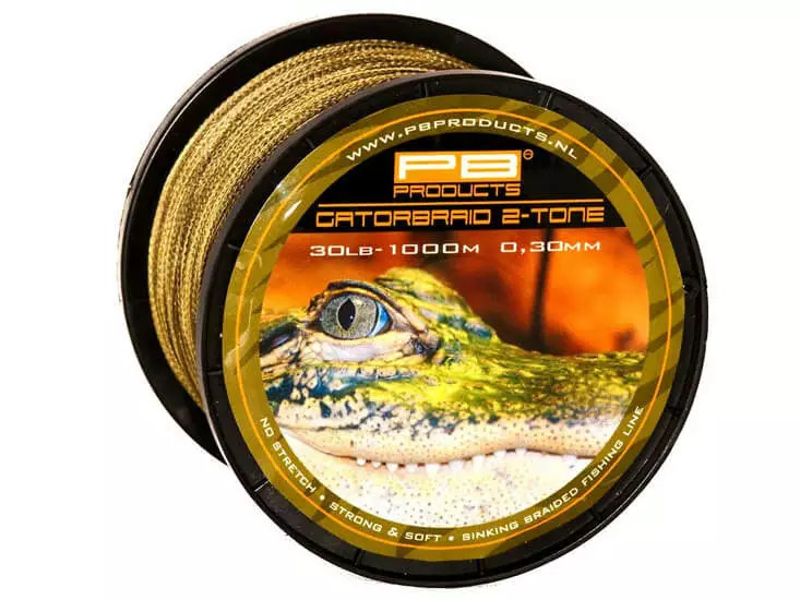 Gator Braid 2-tone van PB Products wordt geleverd op spoelen van 1.000 meter met een diameter van 0,26 mm (25 lb), 0,30 mm (30 lb) of 0,35 mm (35 lb).