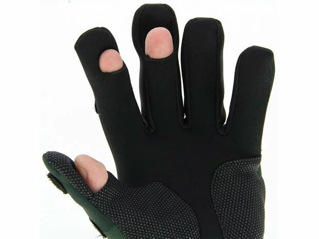 Door de vingertopjes van de duim, wijsvinger en middelvinger naar achteren te klappen kun je gewoon doorvissen met je handschoenen aan.