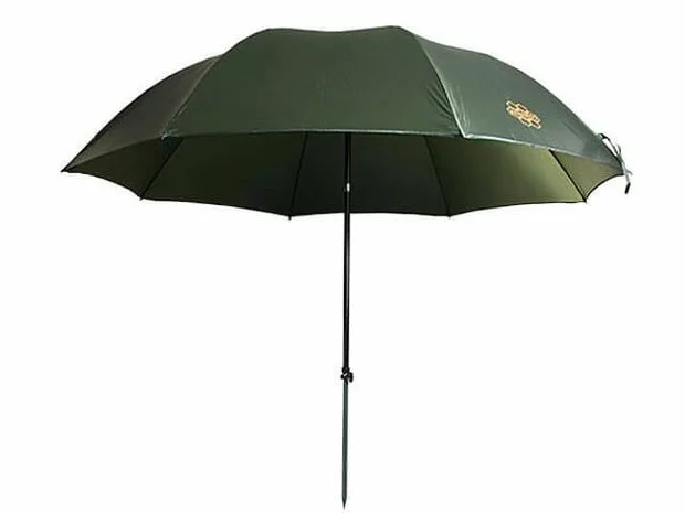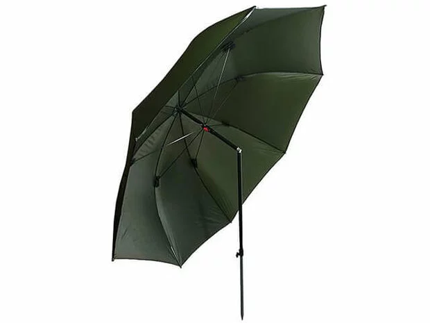 De donkergroene visparaplu is 1,80 meter breed en biedt daarom genoeg ruimte om er samen met je spullen onder te zitten. De steel heeft bovendien een handige knikfunctie, zodat je hem makkelijk kan draaien en ook bij zijwind droog blijft. Als de steel helemaal is uitgeschoven is de lengte hiervan 190 cm.