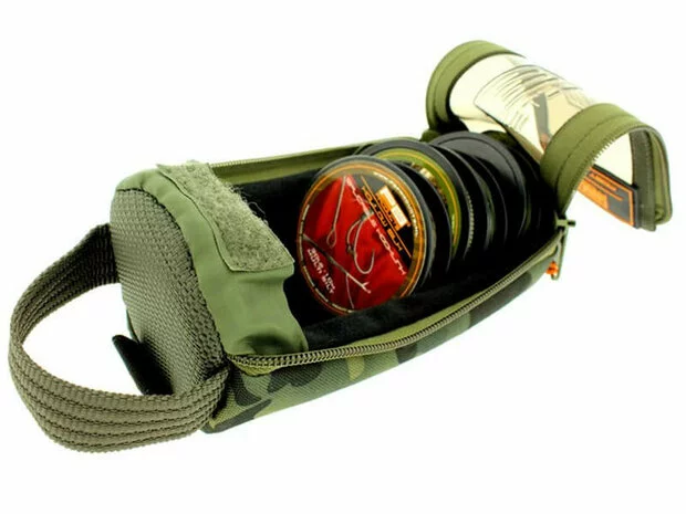 Door de lengte van 18 cm passen er veel spoelen in zodat je al je favoriete lijnen en leaders mee kunt nemen. De dubbele ritsen zorgen ervoor dat je hem makkelijk helemaal open ritst om spoelen er in te doen of er uit te halen. Met een stevig handvat, een transparante voorkant en een stoere camouflage print!