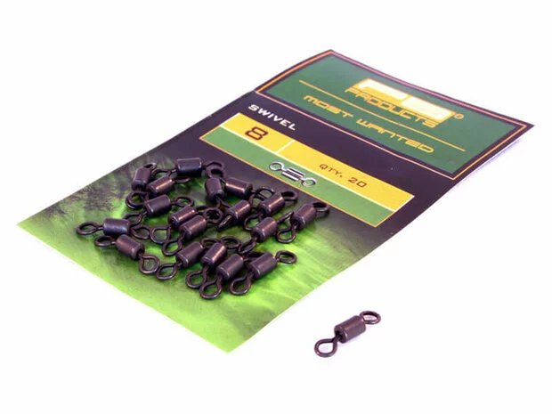 Bij het maken van onderlijnen kun je niet zonder wartels. Dit is de standaard wartel van PB Products die uitgebreid inzetbaar is. Deze ‘rolling swivel’ is in maat 8 en daardoor te gebruiken met vrijwel alle bekene lood soorten.